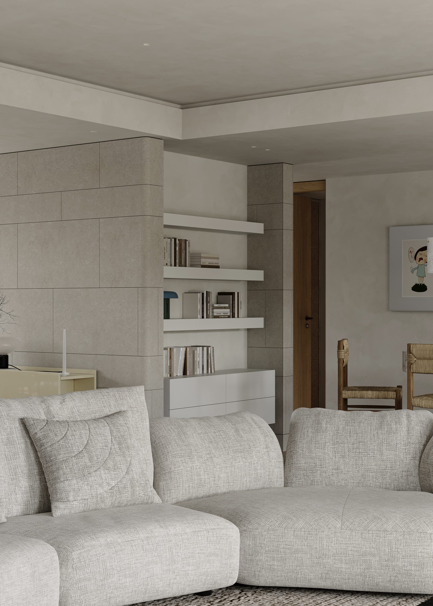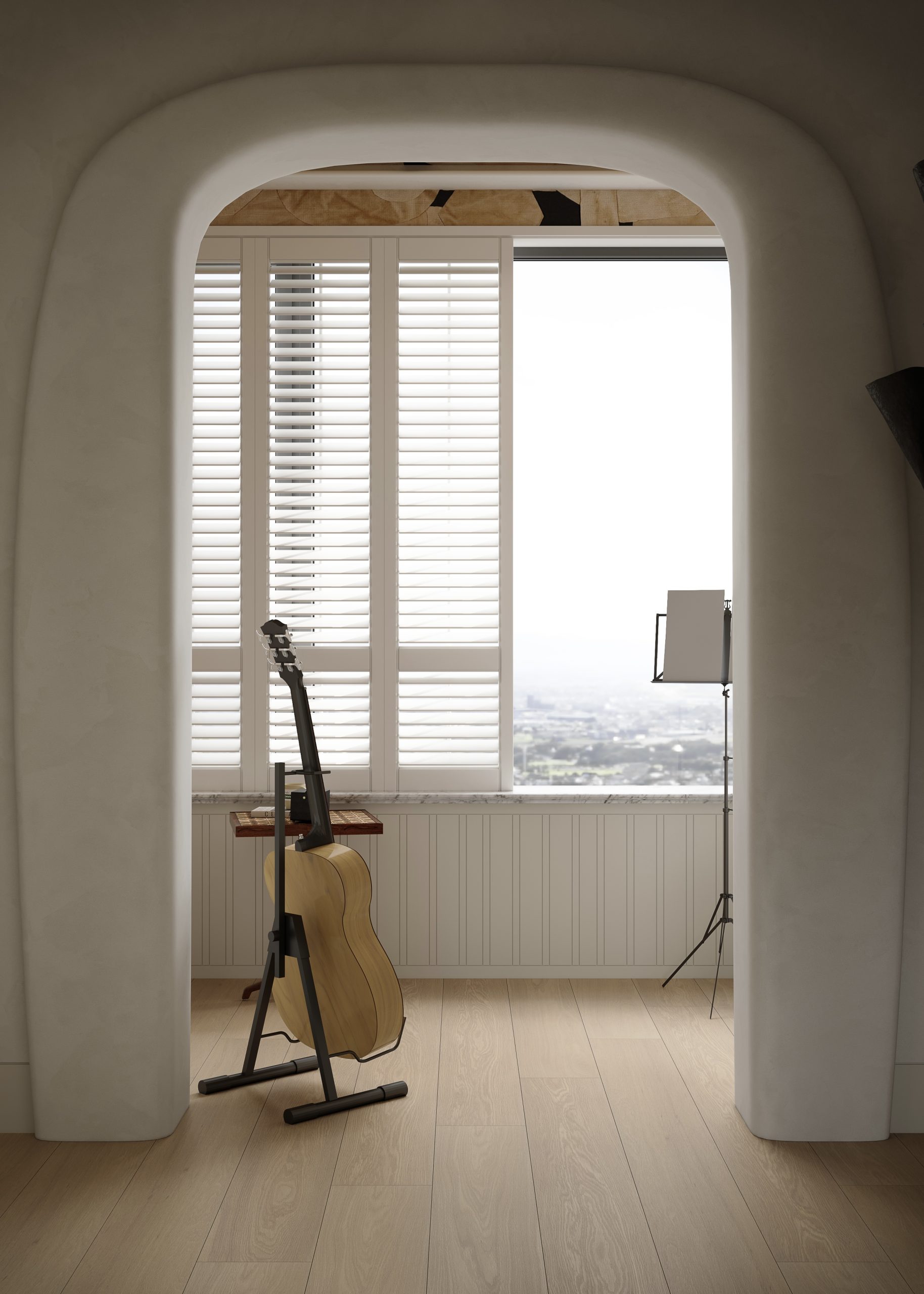 我们用简洁的 GRG 造型优化入口,让空间更具趣味与仪式感,内部顺势围合出一方专属的吉他练琴区,把闲置角落变成治愈身心的小天地。